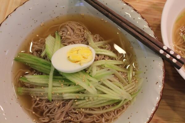 I Mul Neangmeyon sono dei sottili noodles di grano saraceno immersi in una ciotola di brodo freddo, conditi con fettine di cetriolo, rapa, carne e un uovo sodo a coronare il tutto. Il brodo a volte viene servito con ancora del giaccio dentro, il che rende i mul naengmyeon il piatto ideale con cui affrontare la calda e umida estate coreana.