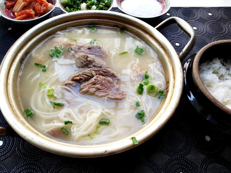 Il Seollongtang è uno dei pilastri della cucina coreana, una buonissima zuppa dal caratteristico color latte, ottenuto bollendo per 15 ore degli ossi di bue. Questa zuppa viene servita calda con pezzi di carne al suo interno e decorata da cipolline verdi; consigliatissimo condirla con un po’ di pepe nero e aglio. Anche questo piatto viene accompagnato da una ciotola di riso, che può essere aggiunta al brodo o mangiato a parte.